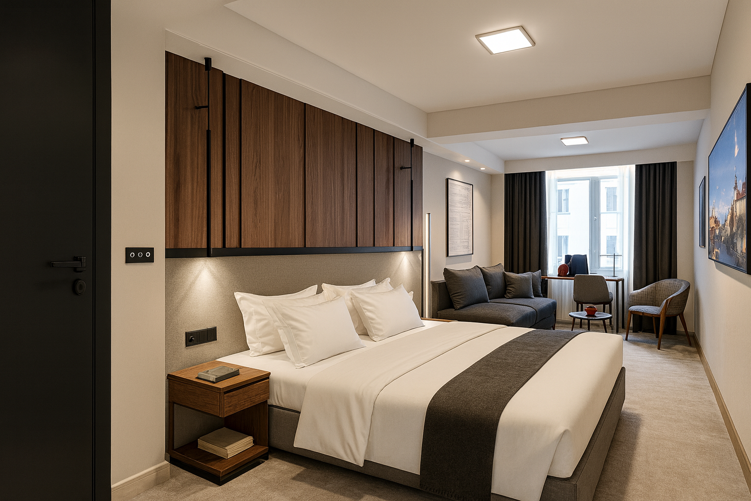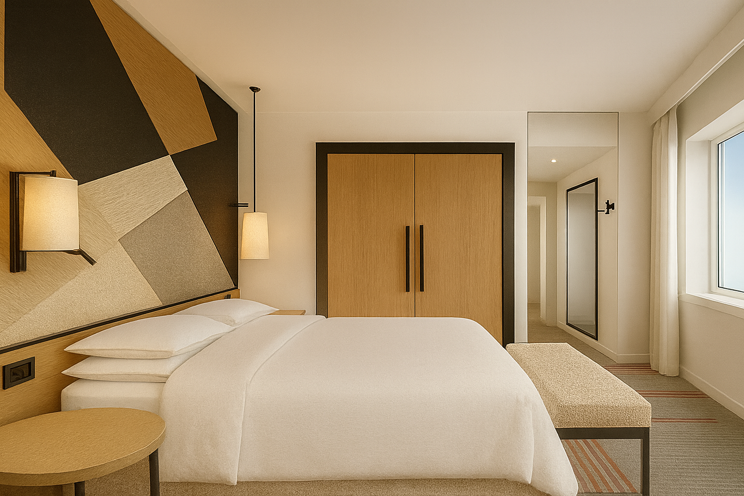 Afhankelijk van het project bieden we twee benaderingen: vooraf samengestelde kamerconcepten of volledig custom made interieurconcepten. Onze modulaire hotelkamerconcepten zijn ideaal voor projecten waarbij snelheid, uniformiteit en budgetcontrole belangrijk zijn. Ze combineren comfort, uitstraling en efficiënt gebruik in één helder concept.