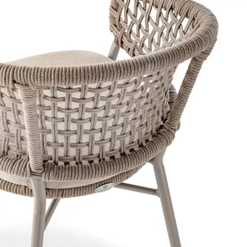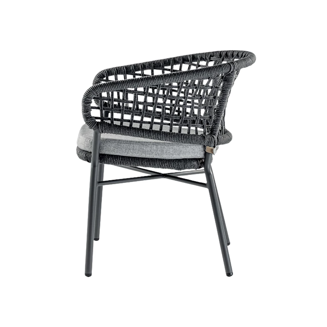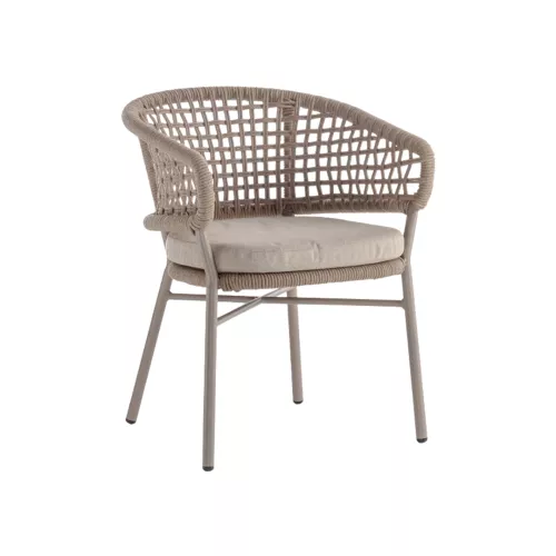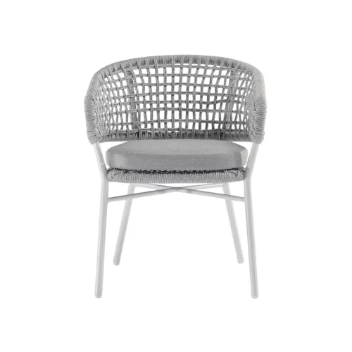 Adon is een stijlvolle buitenstoel met armleuningen, gemaakt van aluminium en afgewerkt met weerbestendig acrylkoord. De zitkussen is bekleed met olefin stof, geschikt voor intensief gebruik. Licht van gewicht en stapelbaar, perfect voor horecaterrassen en diverse interieurstijlen.