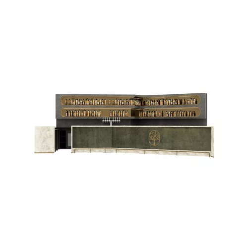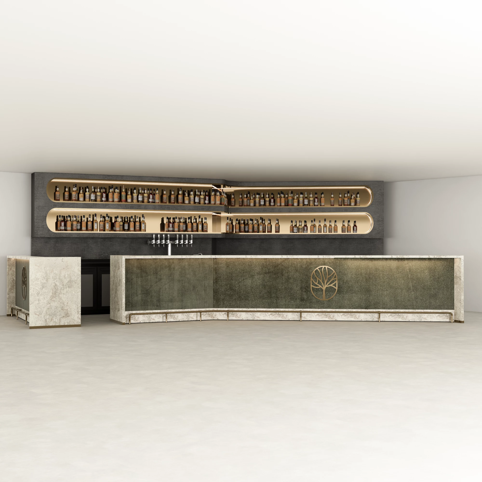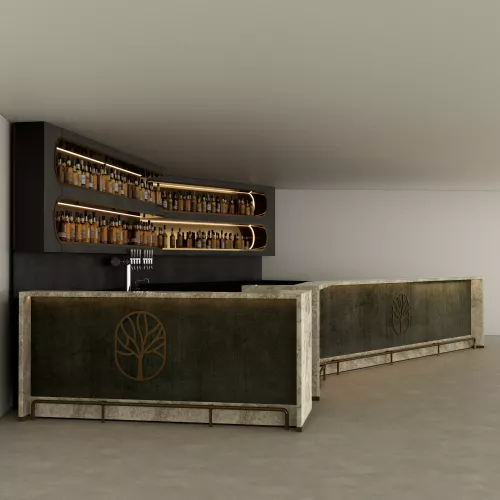 Deze op maat gemaakte bar heeft een modern, strak ontwerp met een verfijnde steenlook afwerking en verlichte schappen. Het front wordt benadrukt door een decoratief embleem dat de ruimte een sterke visuele identiteit geeft. Achter de bar zorgen zwevende planken met geïntegreerde verlichting voor een stijlvolle presentatie van flessen, waarbij functionaliteit en esthetiek samenkomen. Perfect voor eigentijdse horecaconcepten, combineert dit ontwerp duurzaamheid, elegantie en merkuitstraling.