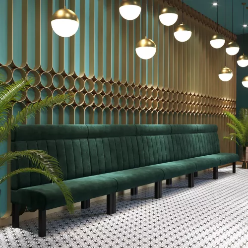 Deze op maat gemaakte Amerikaanse dinerbank brengt een vintage sfeer in elke horecazaak. De zitting is voorzien van hoogwaardig schuim voor langdurig comfort, zelfs bij intensief gebruik. Verkrijgbaar in een ruime selectie van professionele stoffen of kunstleer. Voor ultieme personalisatie kun je ook je eigen stof aanleveren.