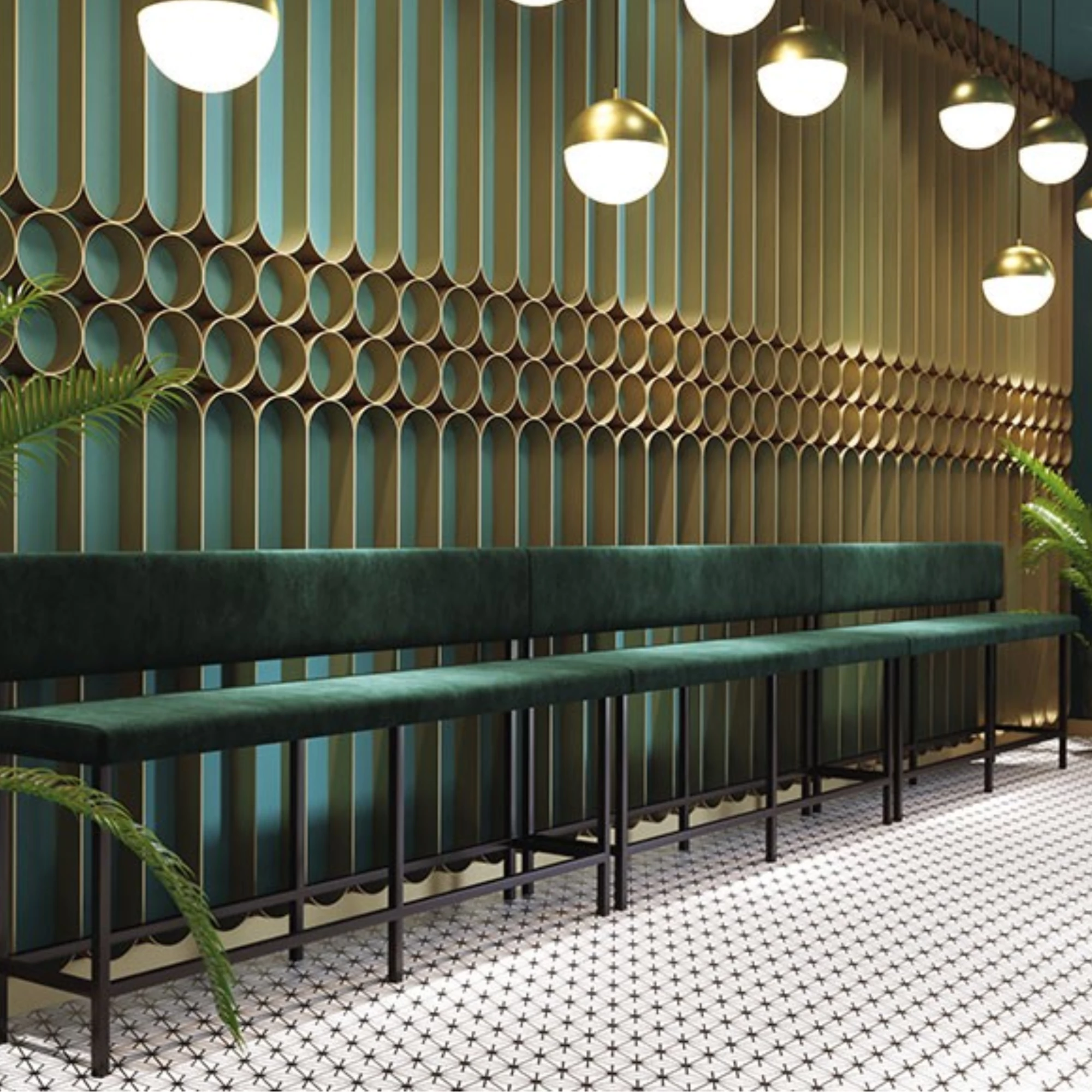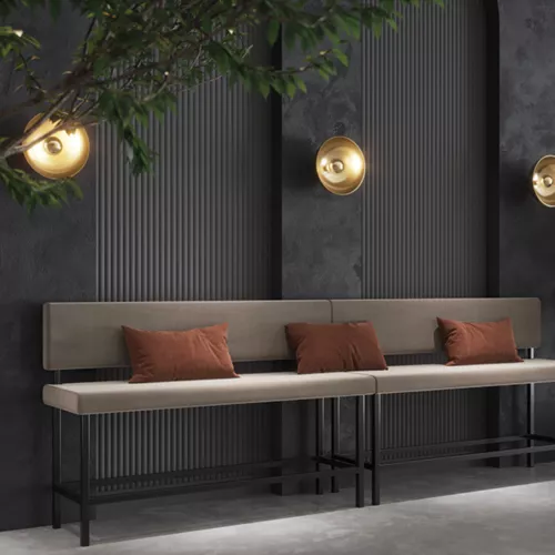 De Arthur-bank is een hoge dinerbank met metalen frame, ontworpen voor horecagebruik. Deze modulaire beklede bank is verkrijgbaar in verschillende kleuren en afwerkingen en kan volledig op maat worden gemaakt. Verkrijgbaar in diverse stoffen en kunstleer. Zitdiepte: 39 cm. Prijs per meter.