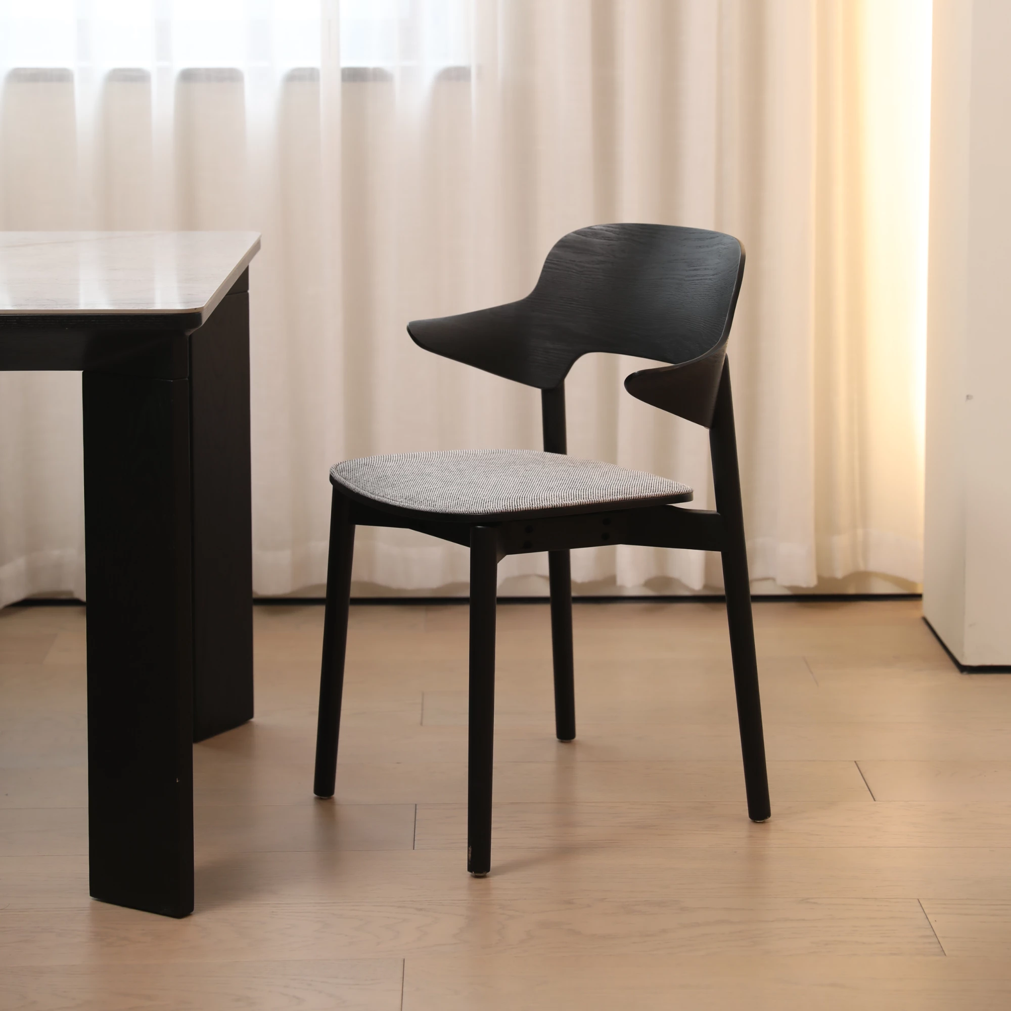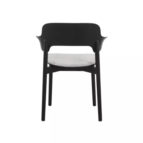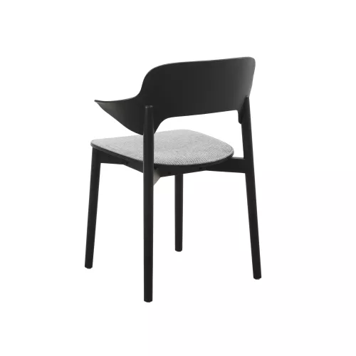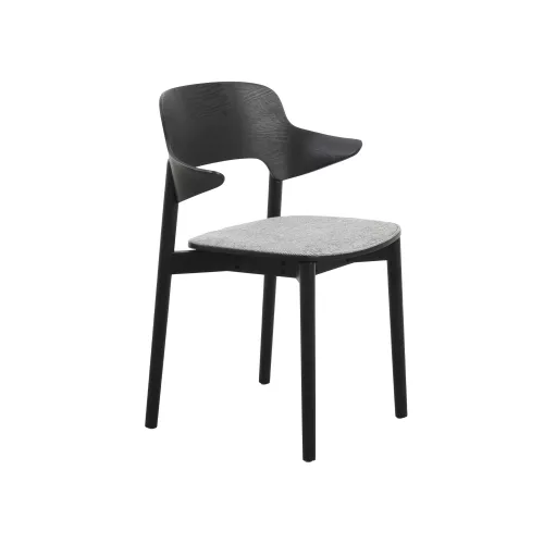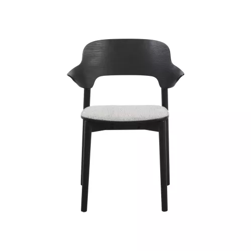 Moderne eikenhouten stoel met armleuningen en beklede zitting voor extra comfort. Gemaakt van massief hout – perfect voor stijlvolle horecaruimtes. Verkrijgbaar in meerdere hout- en stofferingen.