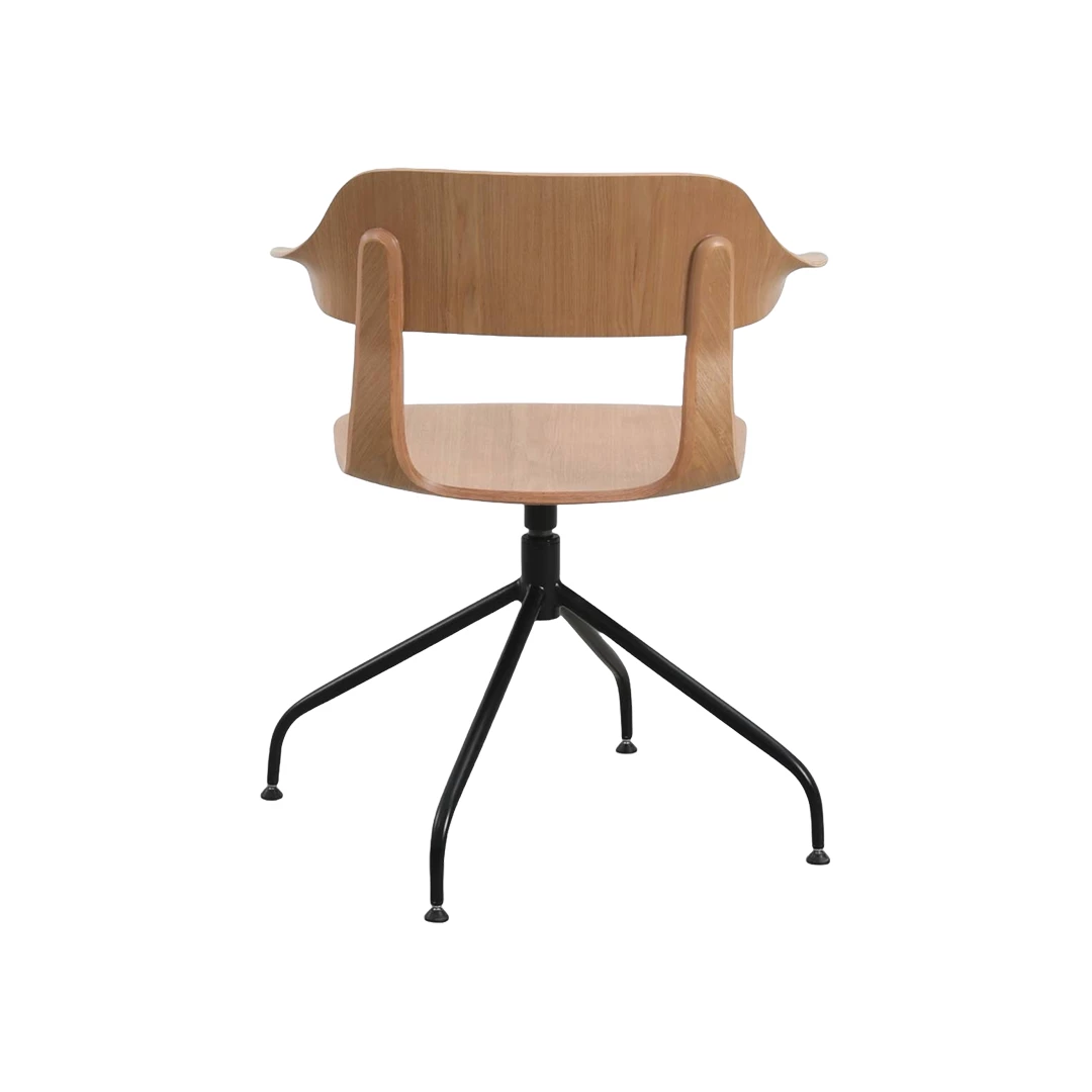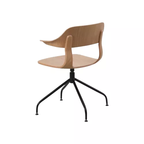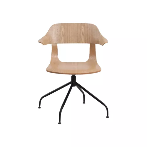 Modern houten stoel met vloeiende lijnen en geïntegreerde armleuningen. De open rug en het elegante eiken zitvlak rusten op een stevige metalen spinpoot, wat zorgt voor een stijlvol én stabiel geheel. Uitermate geschikt voor horeca-interieurs met karakter.