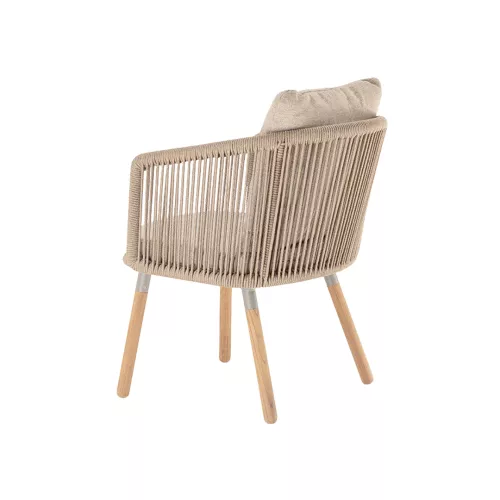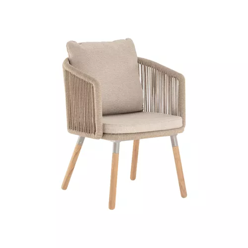 De Bahamas V is een elegante buitenfauteuil met een stevig aluminium frame omwikkeld met polyester touw, voorzien van teakhouten poten voor een natuurlijke uitstraling. Het kussen is bekleed met duurzaam acrylstof, UV-bestendig en biedt comfort. Ideaal voor elke horeca-terras buiten en geschikt voor diverse interieurstijlen.