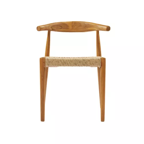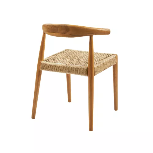 Buitenstoel van duurzaam teakhout, met zitting en rugleuning van hoogwaardig synthetisch riet. Weerbestendig en ideaal voor terras, tuin of balkon. Afmetingen: 55x49x76 cm.