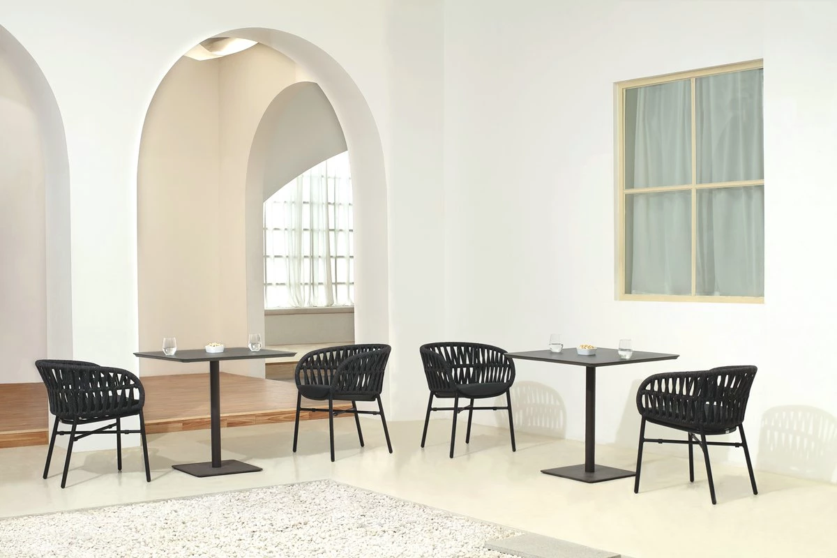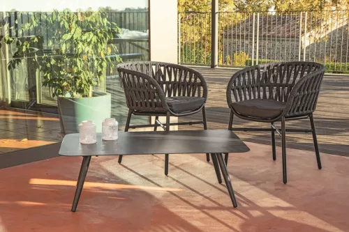 Stackable terrace chair designed for outdoor use. Frame: powder-coated aluminium in anthracite color. Seat and back: textile with integrated foam. Comes with a grey seat cushion included in the price.
