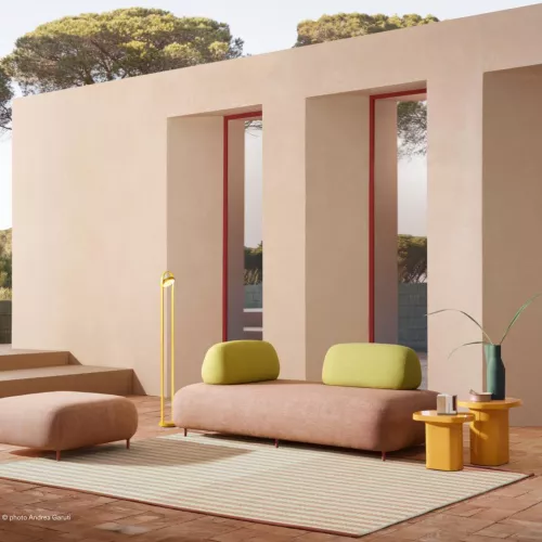 De volledig waterdichte hoes en afneembare stoffen voering voor buiten zorgen voor moeiteloos onderhoud en duurzame prestaties. Dankzij de verstelbare rugleuning van geïnjecteerd polyurethaanschuim, met een glad, organisch silhouet, transformeert de poef elegant in een comfortabele bank – die zich soepel aanpast aan verschillende ruimtes en momenten.