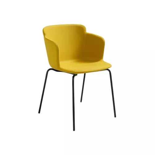 De Calla P M_M TS gestoffeerde stoel met armleuningen combineert comfort en stijl met een stevig metalen onderstel met vier poten, verkrijgbaar in diverse afwerkingen. De gestoffeerde zitting, uitgevoerd in professionele stoffen of kunstleer, garandeert duurzaamheid en elegantie, waardoor hij ideaal is voor diverse horecagelegenheden.