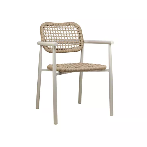 Deze terrasstoel heeft een stevig aluminium frame met een duurzame poedercoating en is geschikt voor intensief buitengebruik. De geïntegreerde armleuningen zorgen voor extra zitcomfort en geven het ontwerp een evenwichtige uitstraling. Verkrijgbaar in groen, beige/zand en charcoal/marineblauw, met bijpassende hoge en lage barkruk. De stoel is stapelbaar en daardoor praktisch en ruimtebesparend voor horecaterrassen.