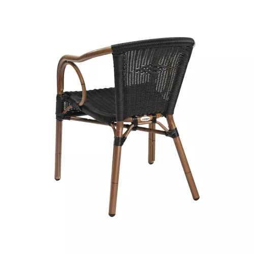 Corino is een buitenstoel met armleuningen en een gepoedercoat aluminium frame met bamboe-look. Zitting en rugleuning zijn van ronde P.E. wicker, beschikbaar in zwart of honingkleur. Weer- en UV-bestendig, stapelbaar tot 8 stuks – ideaal voor horecaterrassen.