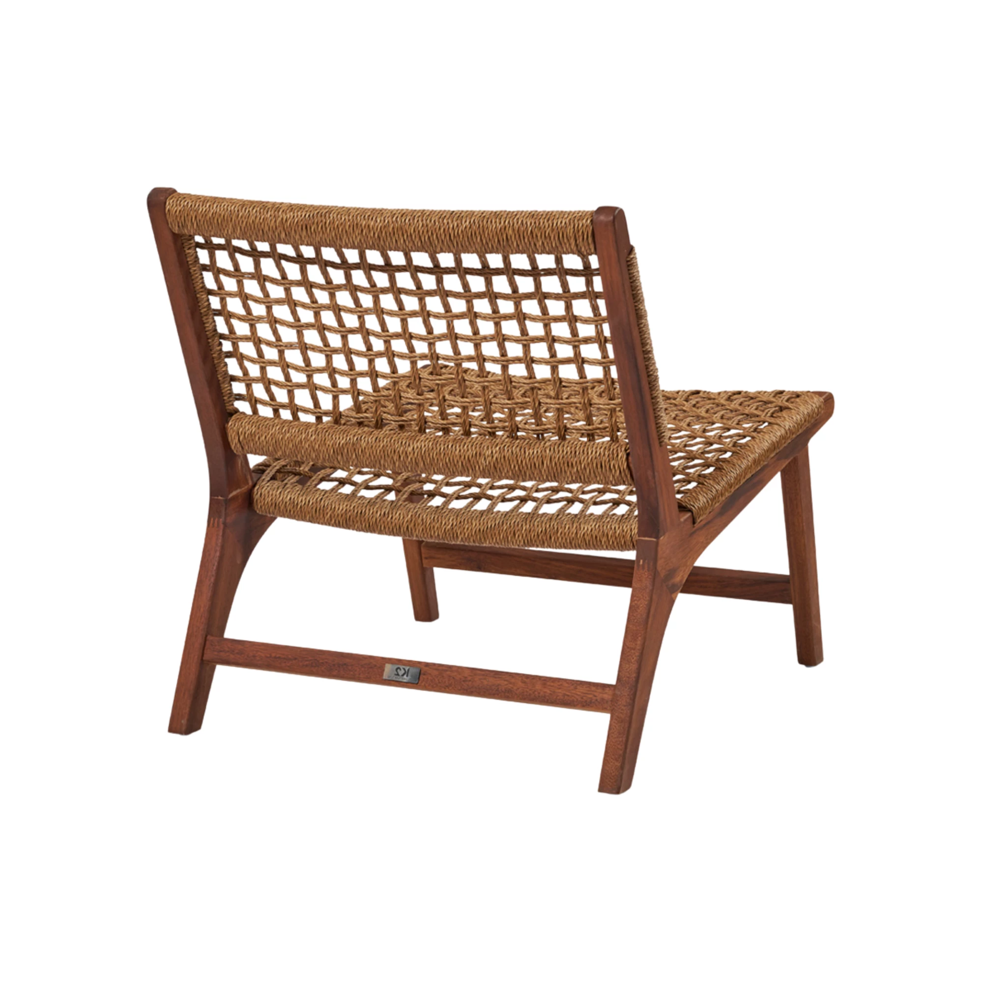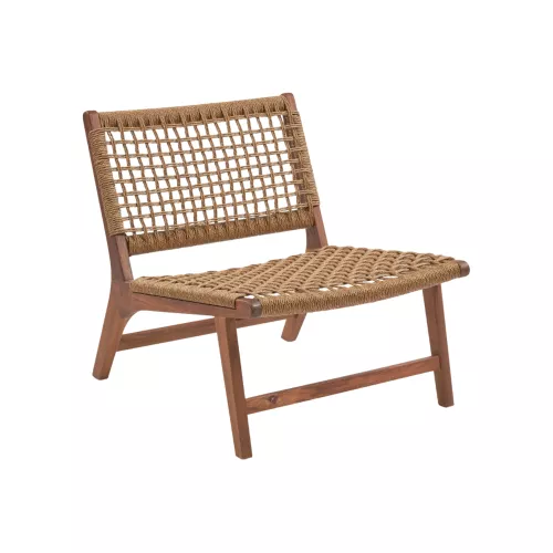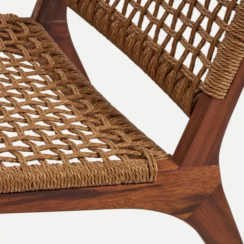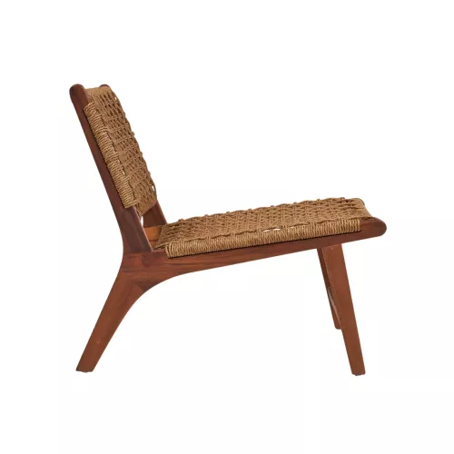 Outdoor fauteuil van duurzaam teakhout met een gevlochten rotan zitting. Geschikt voor terrassen, tuinen en horecaruimtes in de buitenlucht.