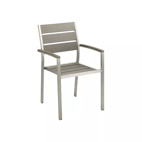 De Dave stoel is een moderne en duurzame keuze voor terrassen en buitenomgevingen. Het stevige frame van geborsteld aluminium is weerbestendig en corrosiebestendig, ideaal voor langdurig gebruik. De zitting en rugleuning zijn voorzien van grijze polywood latten, die de warme uitstraling van hout combineren met het gemak van kunststof. Licht van gewicht maar toch stabiel, is Dave perfect voor horecatoepassingen. Dankzij het moderne ontwerp, het comfort en het onderhoudsgemak is deze stoel een uitstekende toevoeging aan elke buitenruimte.