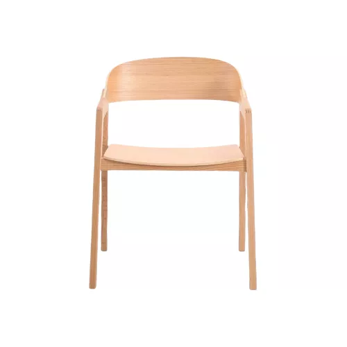 Modern eiken stoel met geïntegreerde armleuningen en een vloeiend gevormde rugleuning. Gemaakt van hoogwaardig massief eikenhout, biedt deze stoel elegantie en duurzaamheid, perfect voor veeleisende HoReCa-omgevingen. Ontworpen om moderne eet- en loungeruimtes te verrijken met comfort en stijl.