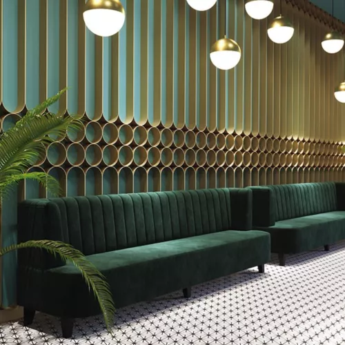 Faith Sofa is een stijlvolle restaurantbank met hoogwaardig schuim met hoge dichtheid voor extra comfort en duurzaamheid. Verkrijgbaar in een ruime keuze aan professionele stoffen of kunstleer. De bank kan volledig op maat worden gemaakt, ook met door de klant aangeleverd materiaal. De prijs is inclusief een zwarte of standaard melamine sokkel of poten van berkenhout, met een stofverbruik van 3,80 m en 1 m voor de beklede achterzijde.