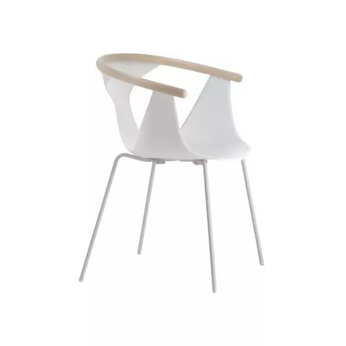 De schaal is van glasvezelversterkt, antistatisch en UV-bestendig polypropyleen. Gebogen rugleuning van massief essen, stalen poten Ø14 mm.