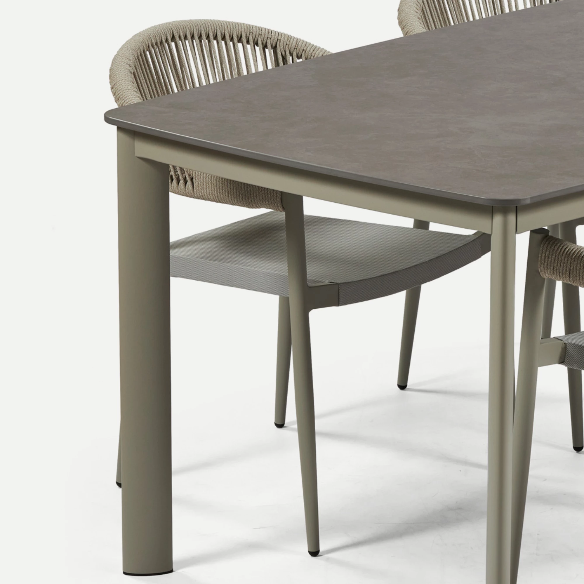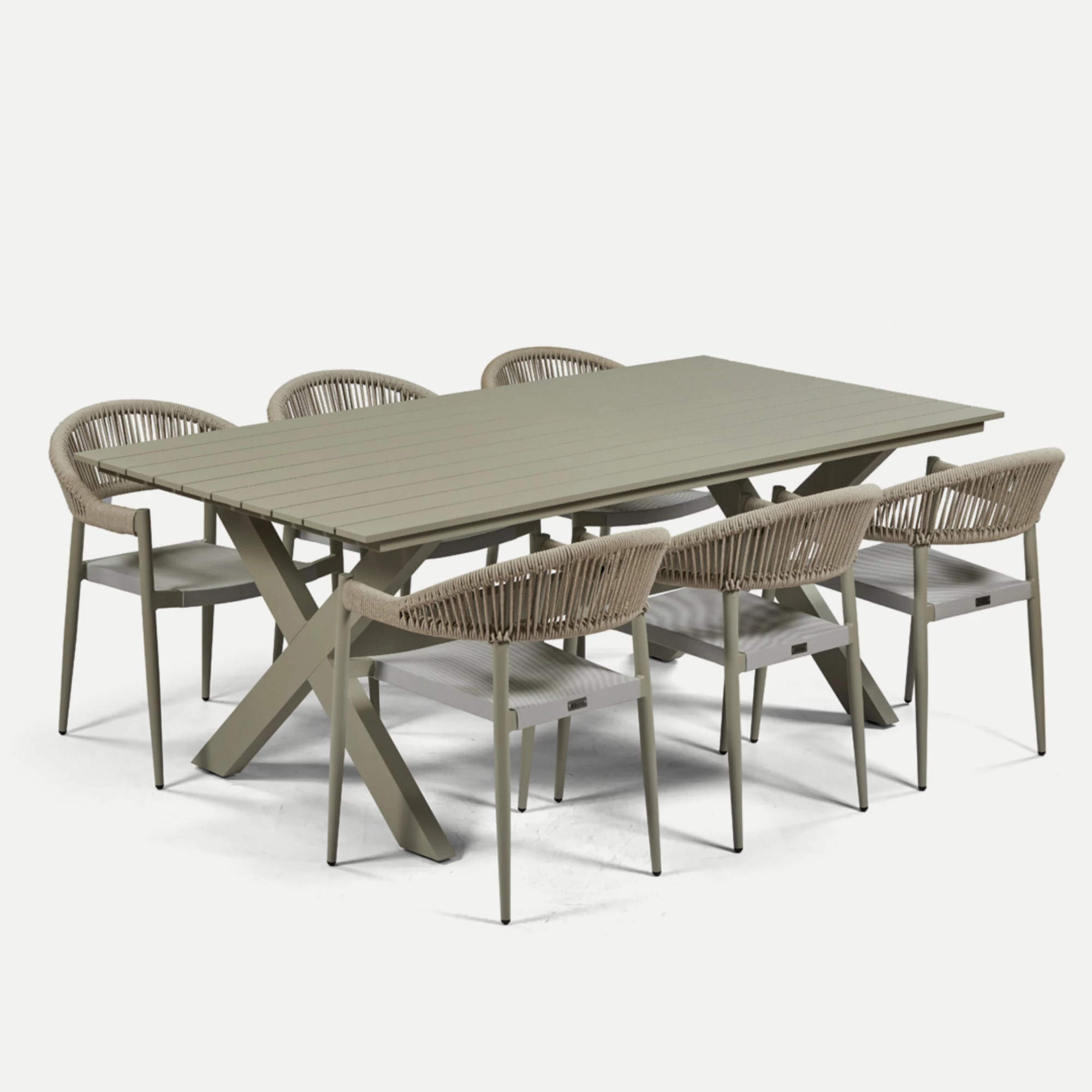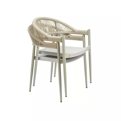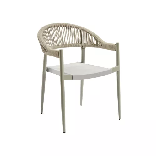 Buitenarmstoel met een opvallend ontwerp, met een rugleuning gevlochten uit stevig touw en een geperforeerde zitting voor extra comfort en ventilatie. Ideaal voor terrassen, tuinen en horecaruimtes in de buitenlucht. Afmetingen: 57x58x76 cm.