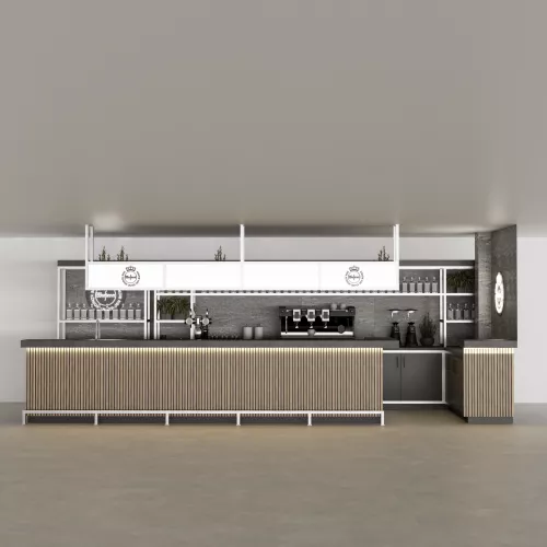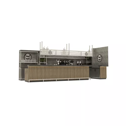 Het servies en het werkblad zijn afgewerkt met HPL in leisteenlook, wat de diepte en verfijning van steen combineert met een strak en praktisch oppervlak. Langs de voorkant zorgt zachte indirecte ledverlichting van 2700K voor een warme gloed, waardoor de bar een uitnodigend, zwevend effect krijgt.