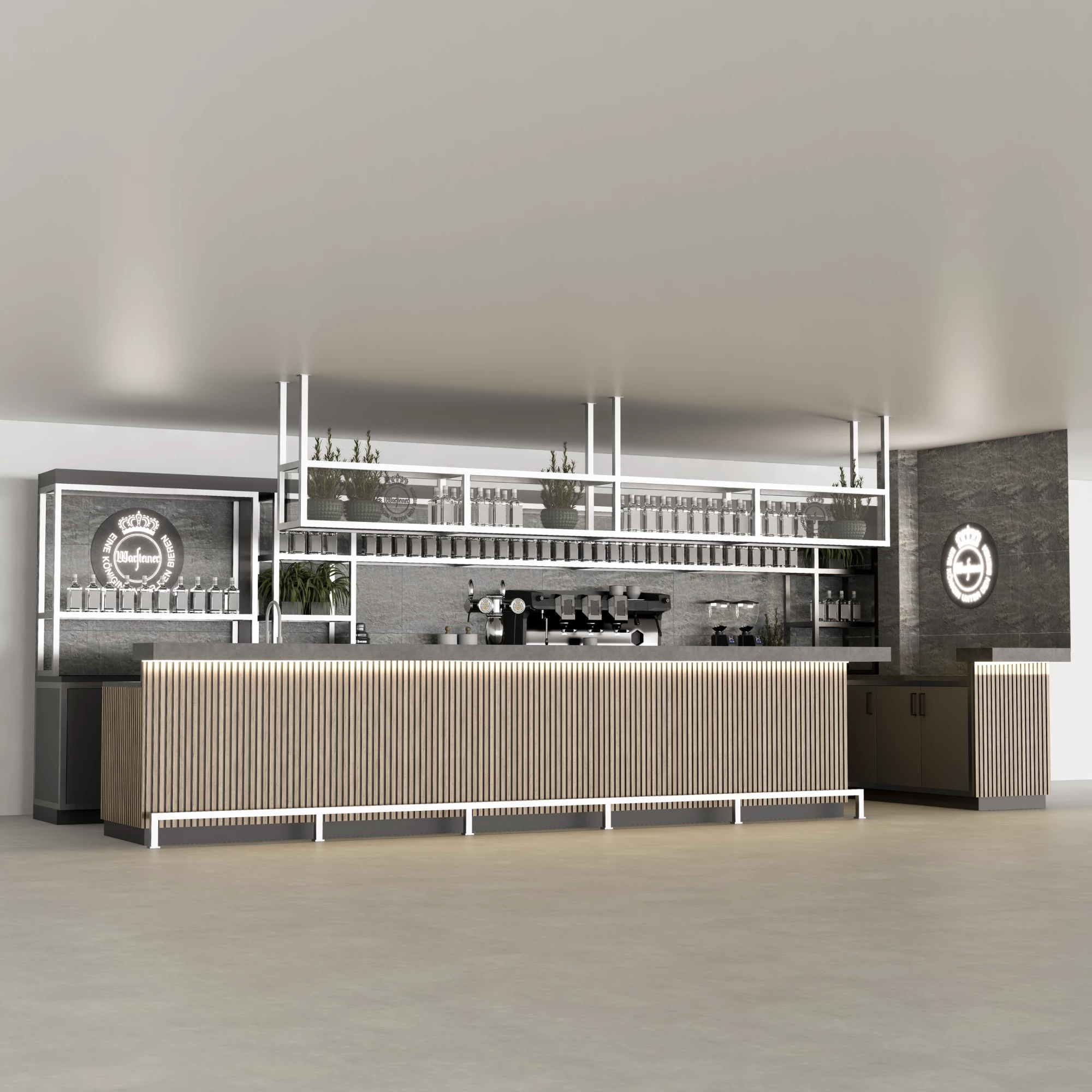 Een neonlogo maakt de compositie compleet met een eigentijds, levendig accent. Het voegt identiteit, warmte en een zachte gloed toe aan de algehele sfeer.