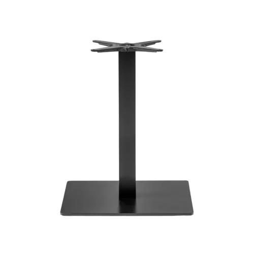 Tafel met een gezandstraalde gietijzeren voet in vierkante vorm, gecombineerd met een gepoedercoate stalen of roestvrijstalen kolom en bijpassende afdekplaat. Tafelblad verkrijgbaar in diverse maten en afwerkingen.