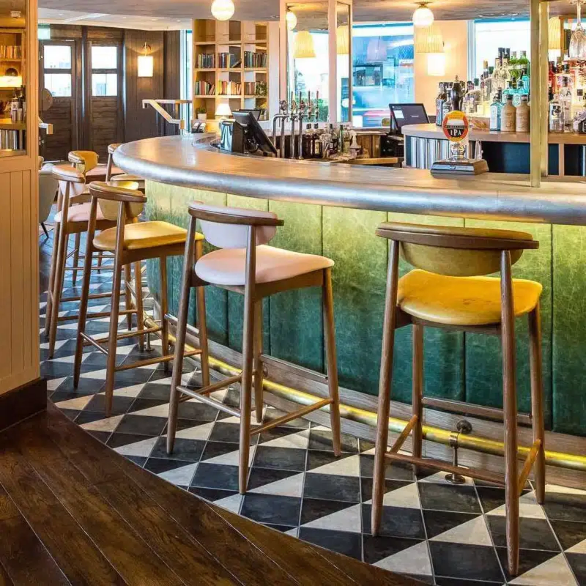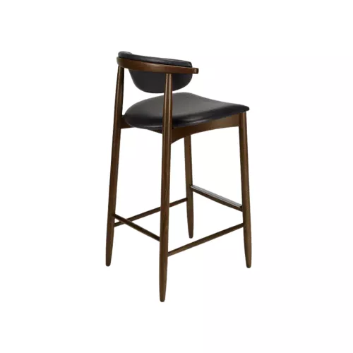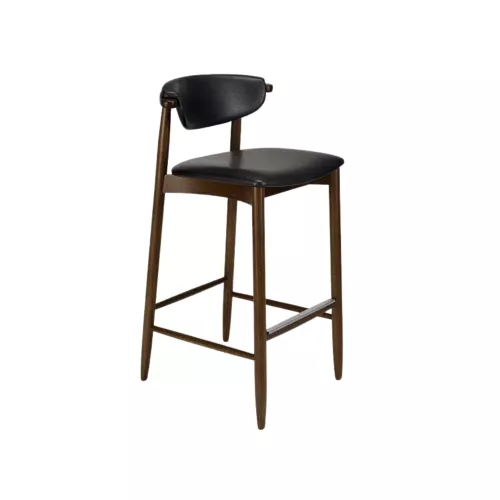 Deze eigentijdse barkruk valt op door de zacht gebogen rugleuning die zowel comfort als elegantie biedt. De zitting en rugleuning zijn bekleed met een breed scala aan hoogwaardige stoffen, waaronder imitatieleer, fluweel of het materiaal van de klant zelf, wat volledige flexibiliteit in personalisatie biedt. Het robuuste houten frame kan in diverse afwerkingen worden gebeitst, passend bij elk interieurconcept. Deze barkruk combineert verfijnd vakmanschap met moderne esthetiek en is een uitstekende keuze voor stijlvolle horecagelegenheden zoals bars, cafés en restaurants.