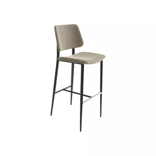 Een verfijnde kruk die moderne materialen combineert met natuurlijke accenten. Het geverfde metalen onderstel zorgt voor stabiliteit en een strakke look, terwijl de zitting en rugleuning bekleed kunnen worden met leer, ecoleer of stof, passend bij elke interieurstijl. Voor een extra vleugje warmte en karakter kan de achterkant van de rugleuning worden afgewerkt met hout. Perfect voor bars, restaurants en elegante horecagelegenheden.