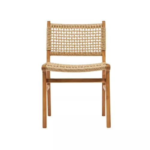 Stoel gemaakt van teakhout met een zitting en rugleuning gevlochten uit synthetisch rotan. De combinatie van massief hout en duurzaam vlechtwerk zorgt voor een natuurlijke uitstraling en maakt de stoel geschikt voor horeca-interieurs en terrassen.
