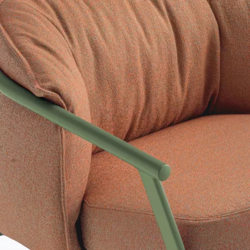 Een ruim kussen van geïnjecteerd polyurethaanschuim rust elegant op elastische banden en zorgt voor superieur comfort en langdurige ondersteuning. De hoezen van de zitting en rugleuning zijn afneembaar en met elkaar verbonden door een discrete rits, waardoor onderhoud moeiteloos is.