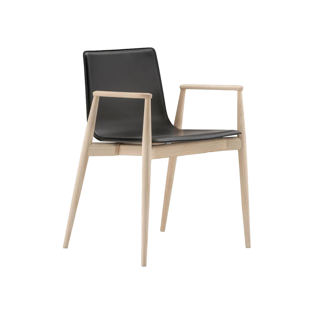 De Malmö 397 fauteuil straalt aangename warmte uit dankzij het essenhout, het taps toelopende silhouet en de klassieke uitstraling. De kuip van echt leer rust op een stevig essenhouten frame en armleuningen, met subtiel verstevigde, naar de randen toe vernauwende verbindingen. Zo ontstaat een binnenfauteuil die degelijke ondersteuning combineert met een luchtige elegantie. Verkrijgbaar in diverse leerkleuren, past de Malmö 397 moeiteloos in ieder interieur.