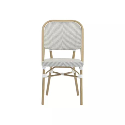 This terrace chair brings colour and personality to outdoor hospitality spaces. Inspired by the lively atmosphere of classic Parisian cafés, it adds a stylish and relaxed touch to terraces, patios, and café settings. The lightweight aluminium frame with a wood-look finish combines durability with a warm appearance, while the UV-resistant woven textile seat ensures comfort and long-lasting outdoor use. Its distinctive colour combinations create a playful visual accent that fits perfectly in vibrant café environments. The chair is available without armrests and comes in two colour options: white/black and blue/beige.