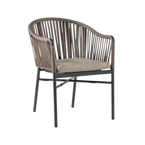 Ontdek Mason, een stijlvolle stapelbare aluminium buitenstoel met armleuningen. De antracietkleurige frame is omwikkeld met taupekleurig textyle touw en ecowicker, wat modern design combineert met weerbestendige materialen. Het bruine Olefin gestoffeerde kussen biedt comfort. Ideaal voor elke horeca terras buiten.
