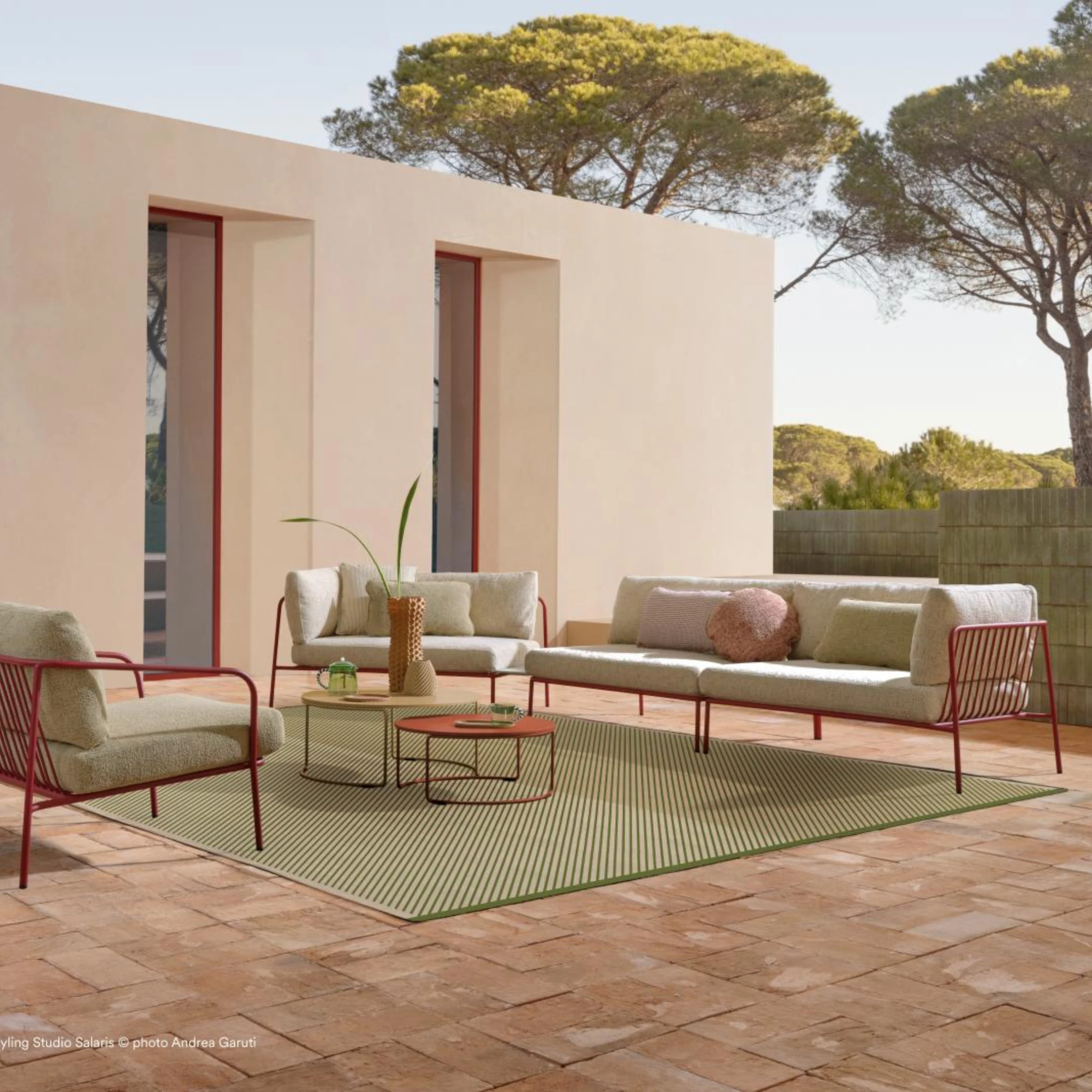 Het hoekelement is voorzien van een gepoedercoat stalen buizenframe, gemaakt voor duurzaamheid buitenshuis. De zitkussens van polyurethaanschuim en de rugkussens van zacht polyester zijn beschermd door een waterdichte voering en afgewerkt met stoffen voor buiten of polypropyleen. Een zijkussen kan worden toegevoegd of weggelaten, zodat de compositie zich op natuurlijke wijze aanpast aan de ruimte.