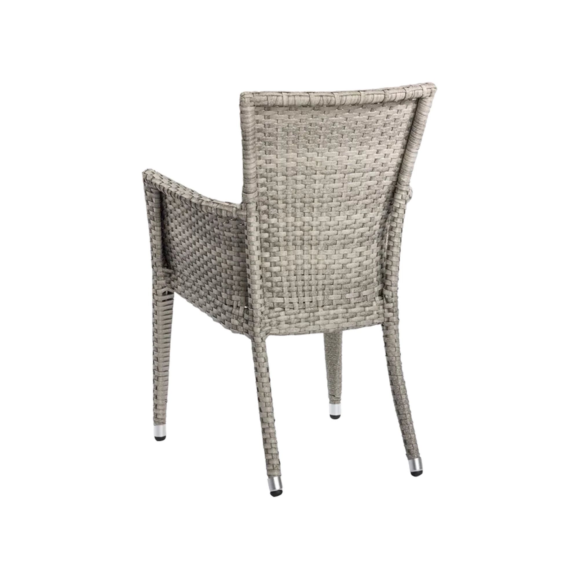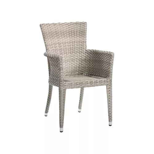 Olga is een buitenstoel met armleuningen, ontworpen voor horecagebruik. Met een zilvermat gepoedercoat aluminium frame, plat PE wicker in asgrijs, en inbegrepen marineblauw zitkussen. UV- en weerbestendig, stapelbaar tot 6 stuks.