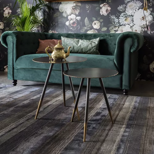 De Ostrom Set bestaat uit twee metalen bijzettafels die een industriële look combineren met elegante accenten. De 3 mm dikke tafelbladen zijn afgewerkt in gunmetal poedercoating en voorzien van grof gelaste gouden randen. De stevige poten met goudkleurige voetjes maken het geheel af. Afmetingen: S – Ø40×44 cm, M – Ø45×50 cm. Perfect voor horeca.
