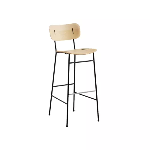 Barkruk met een metalen onderstel met vier poten, ontworpen voor professioneel gebruik in de horeca. De zitting en rugleuning zijn gemaakt van gefineerd essen-, noten- of eikenhout, met zichtbare metalen inzetstukken die passen bij het frame voor een verfijnde en eigentijdse look. Met een zithoogte van 75 cm combineert dit model de natuurlijke warmte van hout met moderne elegantie – ideaal voor hotelbars, restaurants, cafés en stijlvolle loungeruimtes. Een perfecte balans tussen vakmanschap en duurzaamheid voor verfijnde horeca-interieurs.