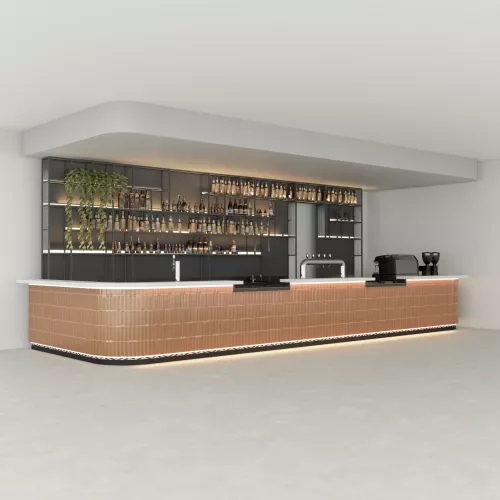 Een verfijnd, eigentijds barconcept met zachte tinten, elegante texturen en een subtiele warmte. Het werkblad is vervaardigd uit een Carrara-kleurig massief oppervlak, wat zorgt voor een strakke, luxueuze marmerachtige esthetiek. De rustige witte adering zorgt vanaf het eerste moment voor een serene, uitnodigende sfeer.