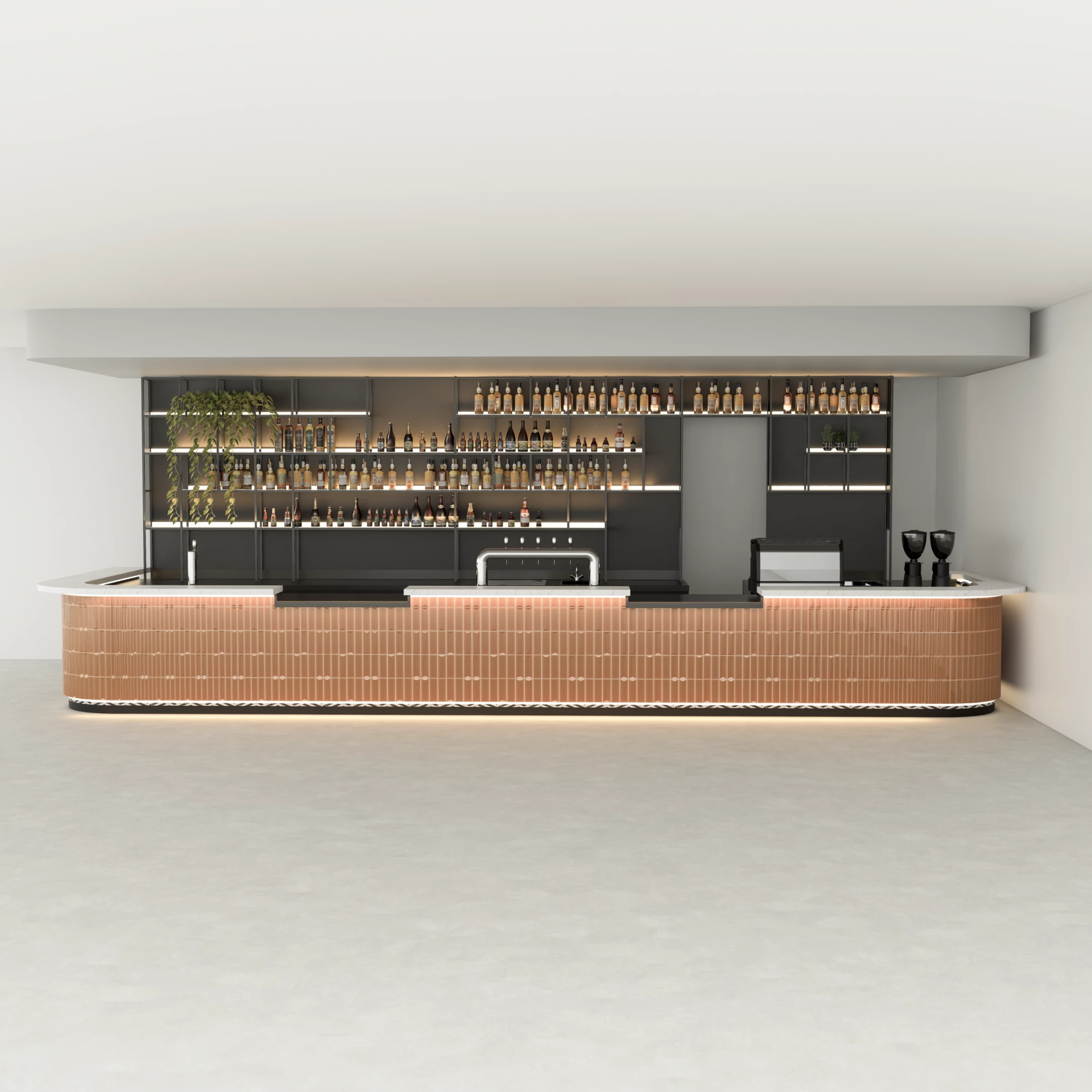 Een verzonken plint met ledverlichting zorgt voor een zwevend effect en produceert een zacht licht dat de structuur van de bar benadrukt zonder de sfeer te overheersen.
