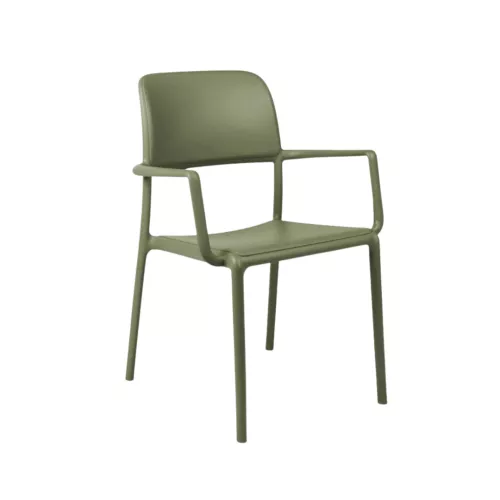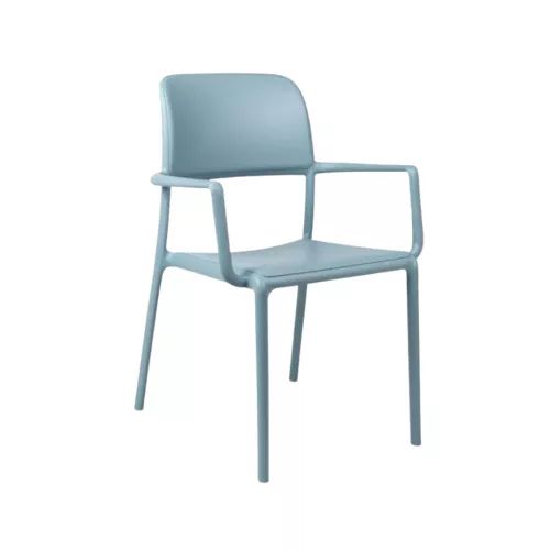 Riva is een stevige monobloc buitenstoel met armleuningen, gemaakt van egaal gekleurd glasvezel-polypropyleen met UV-additieven. De matte afwerking en recycleerbare hars maken hem ideaal voor elk HORECA-terras.