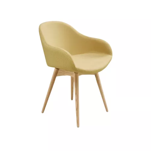 De Sonny-collectie combineert zachte, uitnodigende vormen met sterke, tijdloze materialen. Deze stoel met lage armleuningen rust op een massief gelakt essenhouten frame en combineert warmte en elegantie in een eigentijdse vorm. De gestoffeerde kuip biedt uitzonderlijk comfort en is te personaliseren met een breed scala aan stoffen, waardoor hij perfect past in elk horeca-interieur.