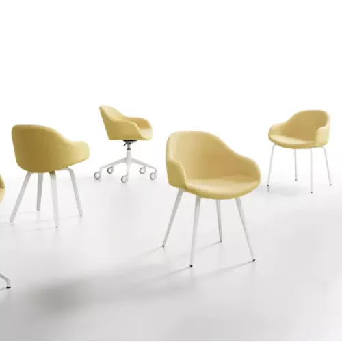 Elegante fauteuil met een vierpootsframe van gelakt staal, ontworpen om stevigheid, comfort en moderne verfijning te combineren. De gestoffeerde schaal kan worden afgewerkt met leer, ecoleer, stof of het materiaal van de klant zelf, waardoor de stoel volledig aanpasbaar is aan elk horeca-interieur. Er is ook een versie beschikbaar met een rugleuning bekleed met een contrasterend materiaal, wat diepte, textuur en visuele interesse aan het ontwerp toevoegt.