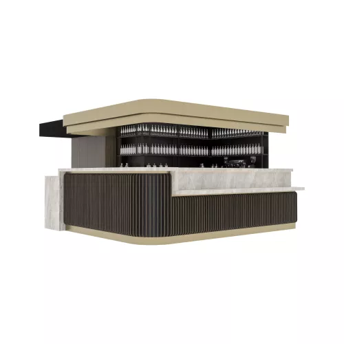 Het gehele corpus is afgewerkt in donker antraciet melamine, waardoor de bar een ingetogen, eigentijdse verfijning heeft die goed past bij de messing- en houtelementen.
