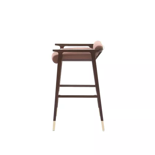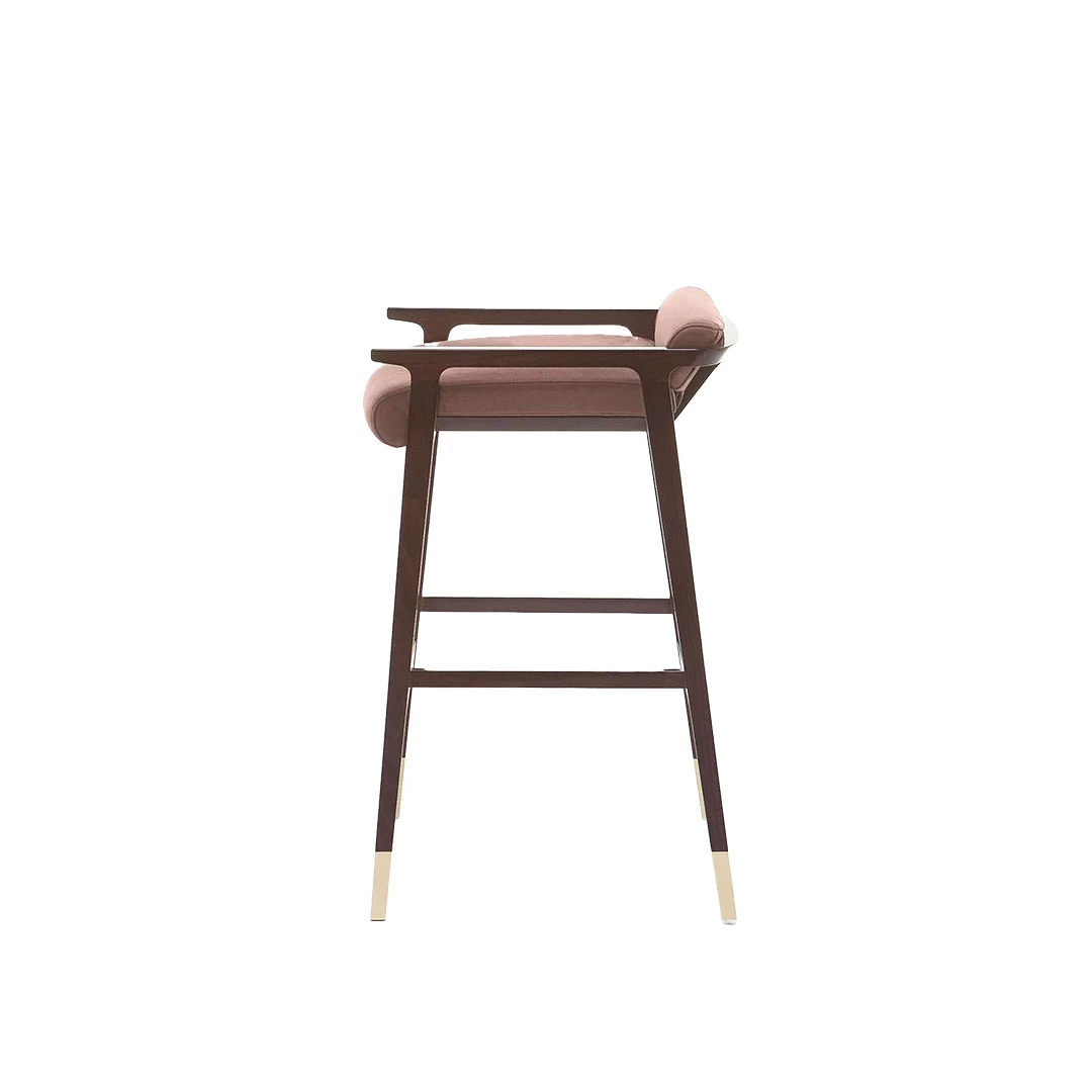 De Tenuo BK houten barkruk combineert elegantie en verfijning, geïnspireerd door 20e-eeuwse designmeesters. Hij is gemaakt van massief beukenhout met messing geanodiseerde roestvrijstalen doppen en voetsteunen, en heeft een gestoffeerde zitting en rugleuning, verkrijgbaar in een breed scala aan professionele stoffen. Perfect voor hotels, bars en horecagelegenheden.