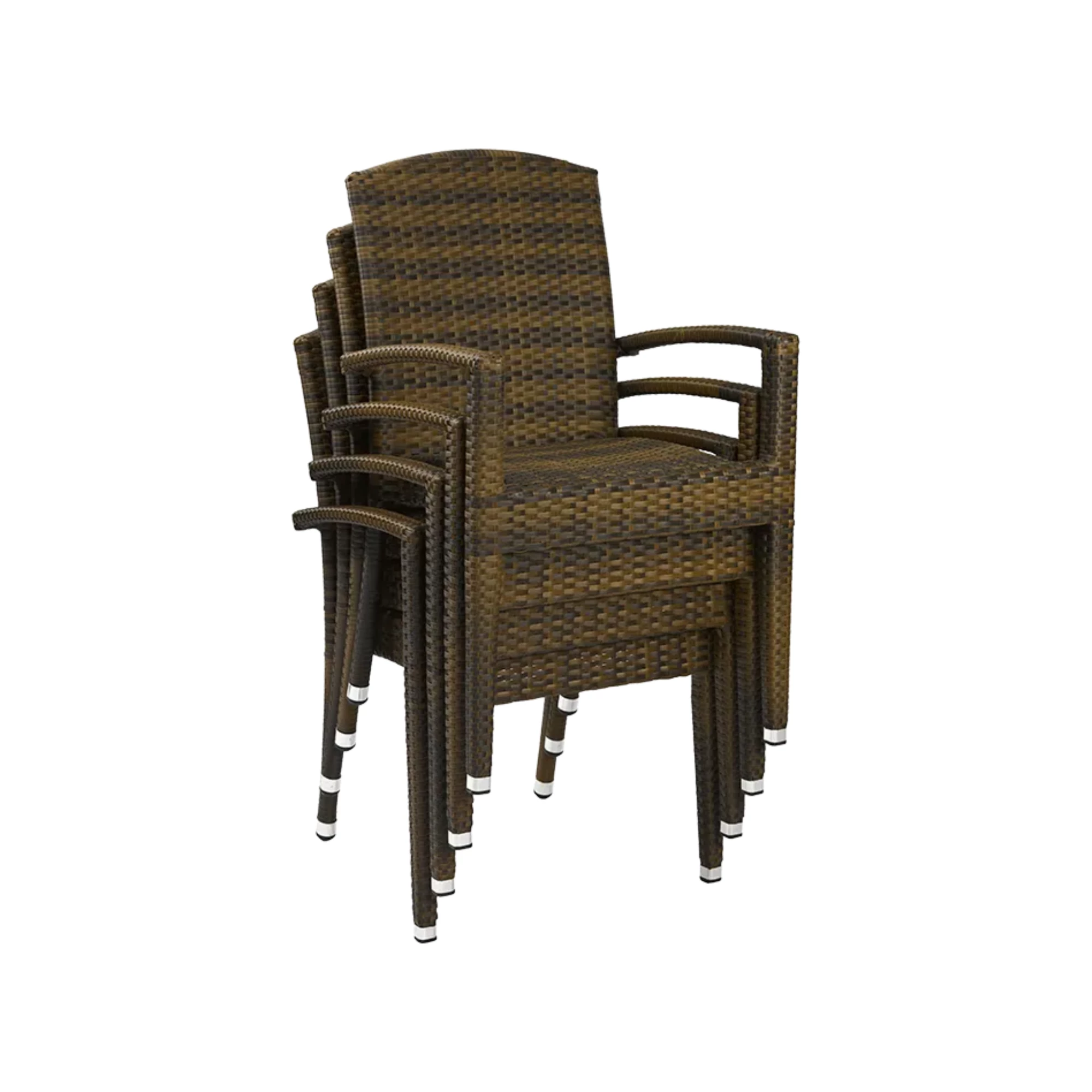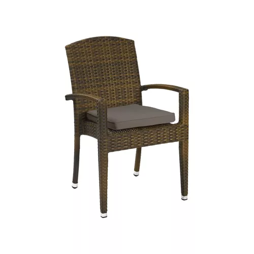 Titus Brown A is een outdoor stoel met armleuningen, voorzien van een gepoedercoat aluminium frame en een zitvlak/rugleuning van plat P.E.-Wicker in gebrande kleur. UV- en weerbestendig, stapelbaar tot 8 stuks. Ideaal voor elke horeca buitenruimte. Optioneel verkrijgbaar met waterafstotend zitkussen.