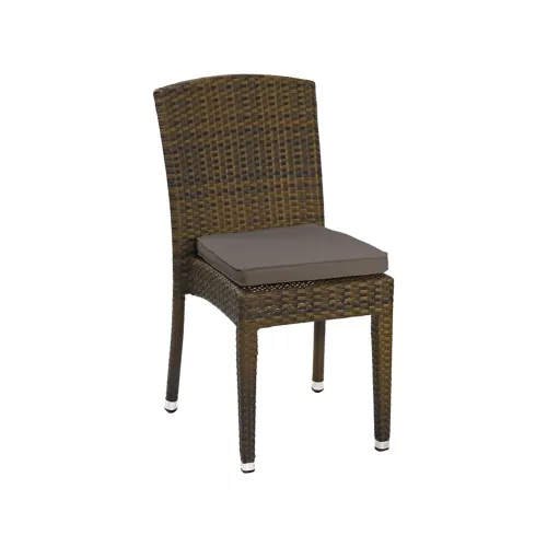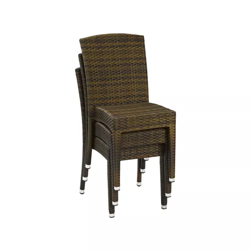 Titus Brown S is een stijlvolle outdoor stoel, ontworpen voor horeca. De gepoedercoate aluminium structuur en het zitvlak/rugleuning van plat P.E.-Wicker in gebrande kleur bieden UV- en weerbestendigheid. Stapelbaar tot 8 stuks. Optioneel zitkussen beschikbaar.