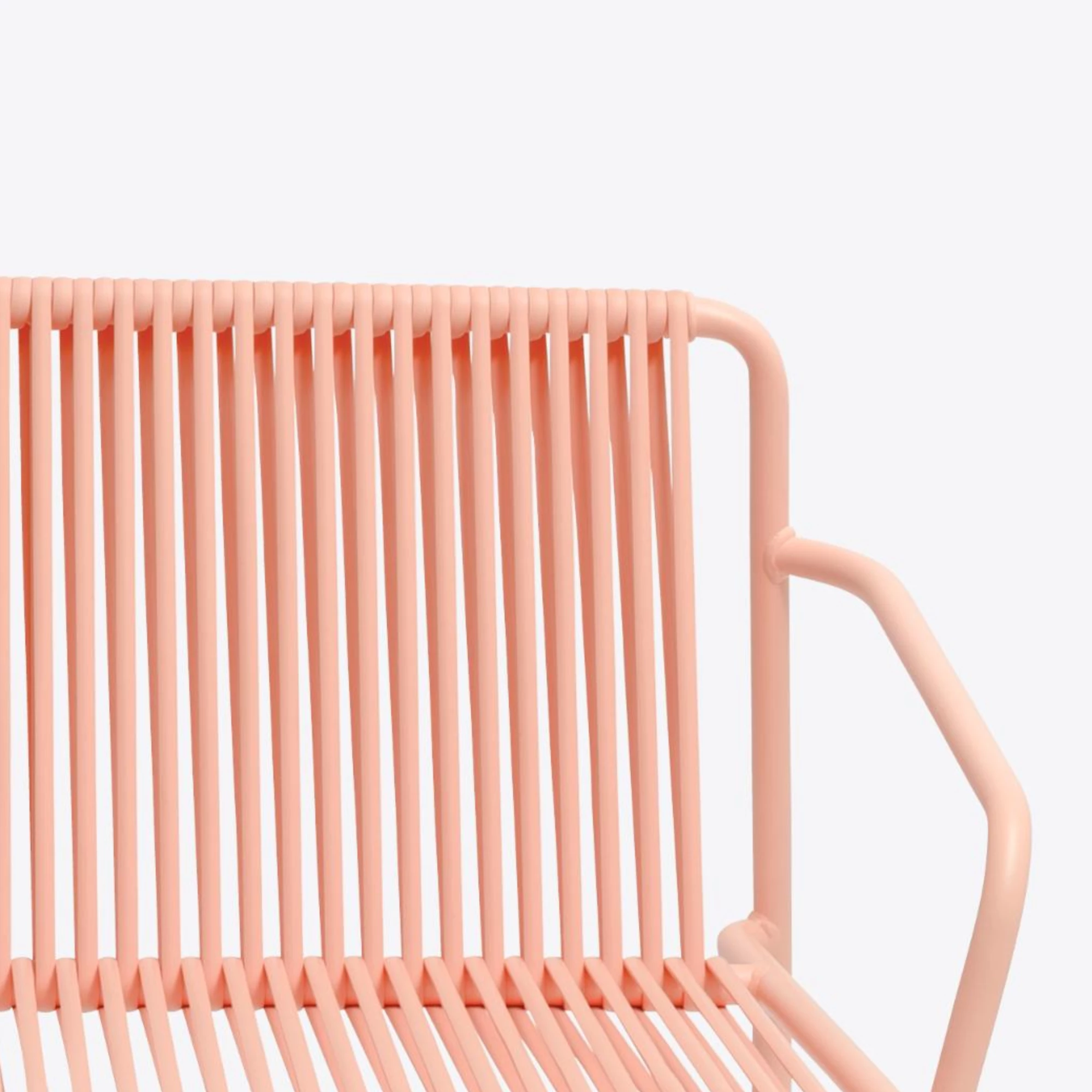 Geïnspireerd door de gastvrije charme van het buitendesign uit het midden van de vorige eeuw, biedt deze tweezitsbank een eigentijdse herinterpretatie van klassieke terrasmeubelen. De stapelbare constructie is opgebouwd uit een stalen buisframe van Ø20 mm met een duurzame poedercoating voor buitengebruik. De zitting en rugleuning zijn gemaakt van verticaal geweven geëxtrudeerd PVC met een nylon kern, wat zorgt voor flexibiliteit, weerbestendigheid en langdurig comfort. Speciaal ontworpen voor buitenomgevingen, ideaal voor terrassen, tuinen, zwembaden en horecagelegenheden.