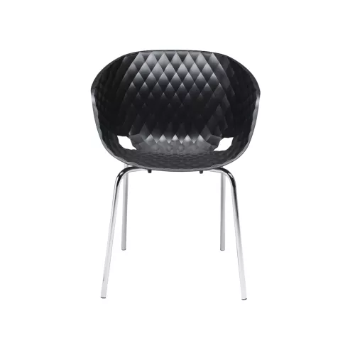 De Uno 594 is een elegante designfauteuil met een stevig stalen frame op vier poten en een comfortabele zitschaal van polypropyleen. Het metalen onderstel is verkrijgbaar in een verchroomde uitvoering of met een poedercoating die geschikt is voor buitengebruik, in zwart of wit. Op aanvraag kan de stoel worden geleverd met een speciale behandeling voor volledige outdoorbestendigheid. Snelle levering is mogelijk voor de versie met zwarte schaal op zwart frame en de versie met witte schaal op wit frame.