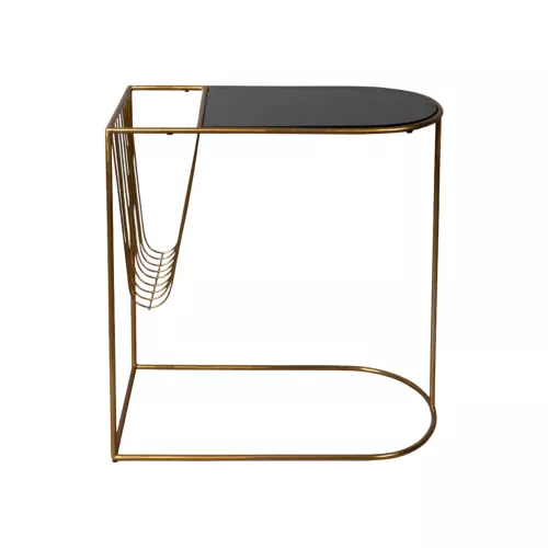 De Velora bijzettafel brengt elegantie en functionaliteit in elke horecagelegenheid. Het koperkleurige stalen frame en het glanzende rookglazen blad zorgen voor een verfijnde look, terwijl het ingebouwde tijdschriftenrek voor extra functionaliteit zorgt. Met zijn slanke silhouet en hoogte van 51 cm past hij perfect naast loungestoelen en creëert hij een warme en uitnodigende hoek voor gasten.