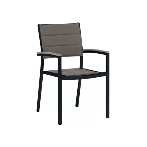 De Vicki aluminium textilene stoel combineert stijl, comfort en duurzaamheid. De gelaste aluminium constructie is gemaakt van buizen van 38×19×1,2 mm, wat zorgt voor stabiliteit en eenvoudig gebruik. De poedercoating biedt langdurige bescherming tegen weersinvloeden, ideaal voor buitengebruik. De zitting en rugleuning zijn gevuld met zachte poppenvulling (doll cotton) voor extra zitcomfort. Het ademende textilene-materiaal is perfect voor warme dagen. De armleuningen van PS-hout geven de stoel een warme, natuurlijke uitstraling. Een ideale keuze voor tuin, terras of balkon.