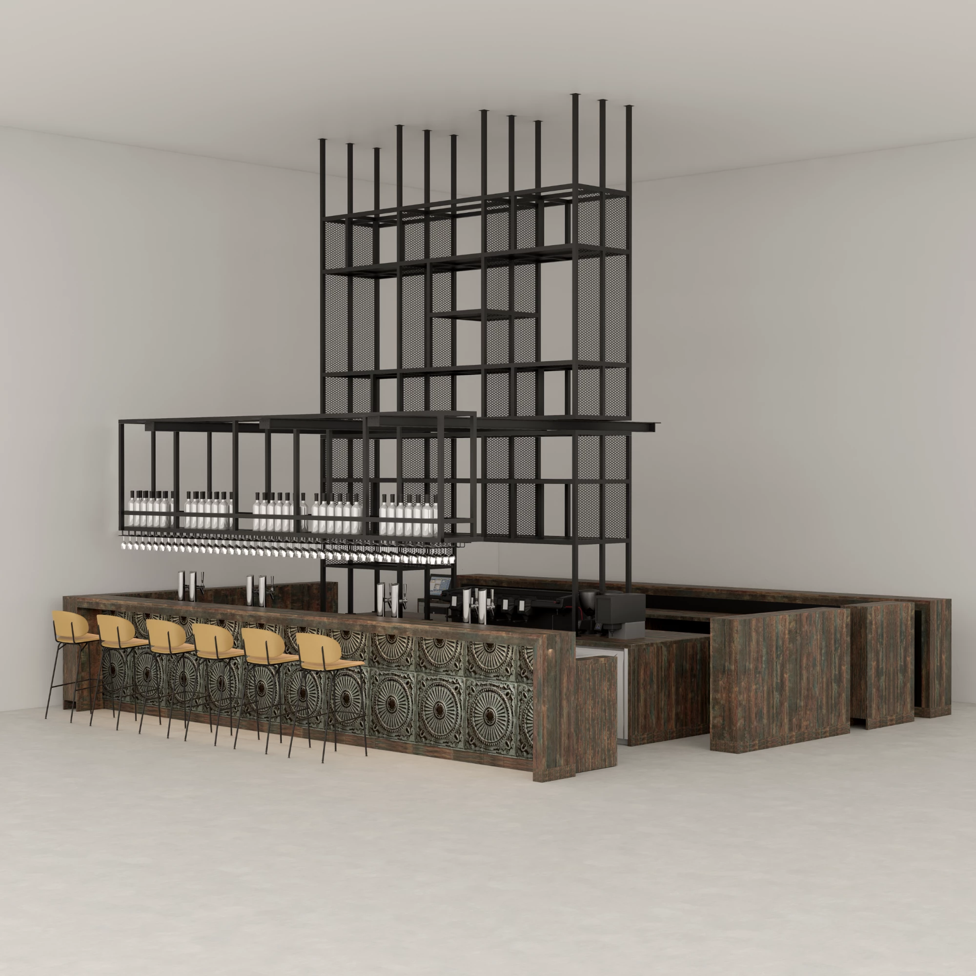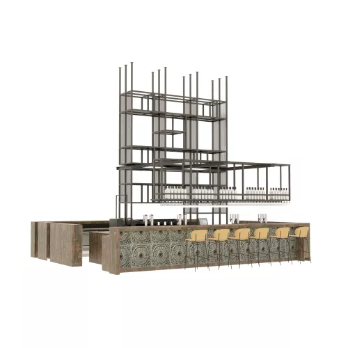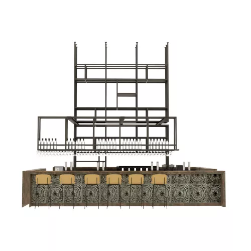 Een bar ontworpen voor moderne horecagelegenheden, waar warmte, metalen verfijning en architectonische stijl samenkomen in een verfijnd middelpunt.