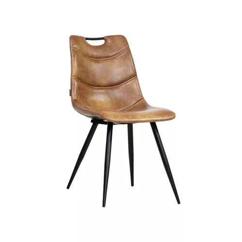 Deze stoel heeft een bekleding in lederlook en zwarte metalen poten – een perfecte combinatie die een stevig geheel vormt. Dankzij het industriële karakter past deze stoel uitstekend in een modern of industrieel interieur.