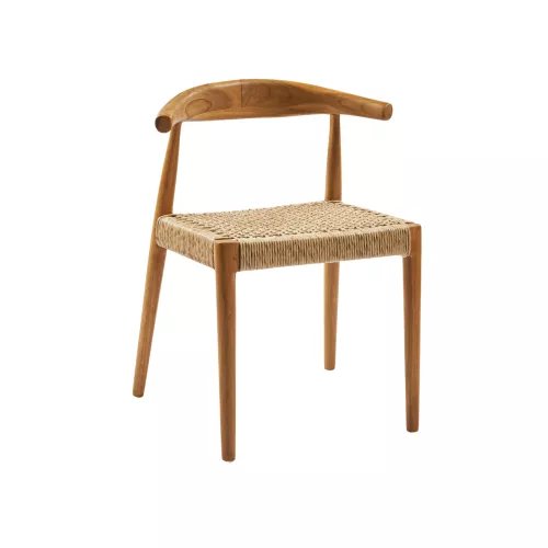 Buitenstoel van duurzaam teakhout, met zitting en rugleuning van hoogwaardig synthetisch riet. Weerbestendig en ideaal voor terras, tuin of balkon. Afmetingen: 55x49x76 cm.